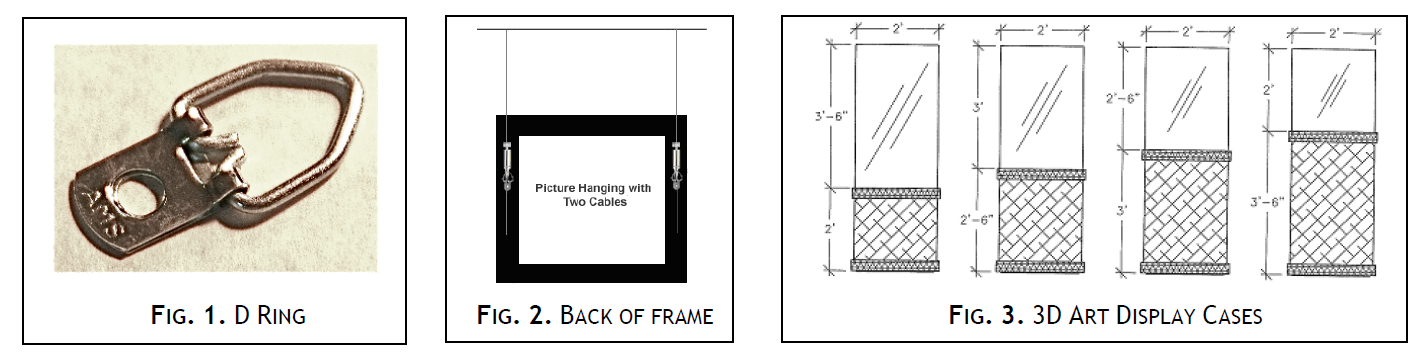 Two-dimensional works displayed in Initial Point Gallery must be comprised of professional-quality, ready-to-hang, original art. Reproduction prints will not be accepted. Initial Point Gallery is equipped with a track system for hanging two-dimensional artwork. Two-dimensional works should not exceed 5’ in height. Two-dimensional artwork will be hung from cables, using hooks, and therefore must be equipped with two D rings (fig. 1) on the side rails on the back of the frame (fig. 2). The inside of each D-ring must allow a space of at least one-quarter inch (¼”) for insertion of the hooks; any wire constricting this space must be removed. The D rings should be approximately a quarter of the distance of the total frame height from the top of the frame (or less) in order to avoid slanting away from the wall. Wires, eyehooks, and clip frames may not be used for hanging. Salon style is possible. Initial Point Gallery also provides four display cases, each with different dimensions (fig. 3), for displaying three-dimensional artwork.