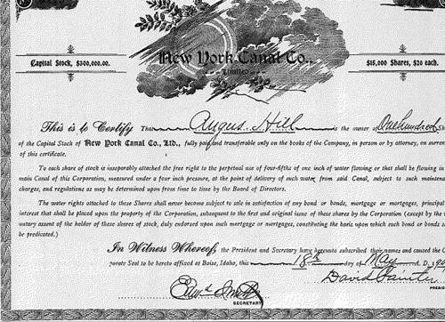 This document dated May 18, 1907, certified farmer Angus Hill as the owner of 100 shares of capital stock of the New York Canal Company Limited. Angus arrived in Idaho in 1888 from Powersville, Putnam County, Missouri, and owned sheep in the Mountain Home area before filing a homestead claim on Ten Mile Creek in 1891. He died in 1938 and his eldest son, Angus, took over the family farm, where he raised hay and grain, and also had a herd of dairy cows. As a single man, he followed the example of earlier landowners and donated the first acre of land for the Hillsdale School, a 1st – 8th grade common school. Later, he donated another acre so there was enough land for a ball field and play area adjacent to the school. Currently construction is underway for a new Hillsdale School, an elementary school slated to open in Fall 2016 on the original homestead property and adjacent to the Century Farm subdivision, also on the homestead property.
